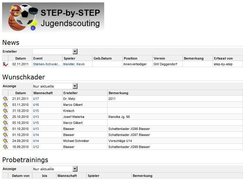Das Modul Scouting dient der Verwaltung aller externen, gescouteten Nachwuchsspieler. Es können beliebig viele Wunschkader mit eigenen und externen Spielern angelegt werden. Hier werden News, Probetrainings und weitere Events verwaltet.